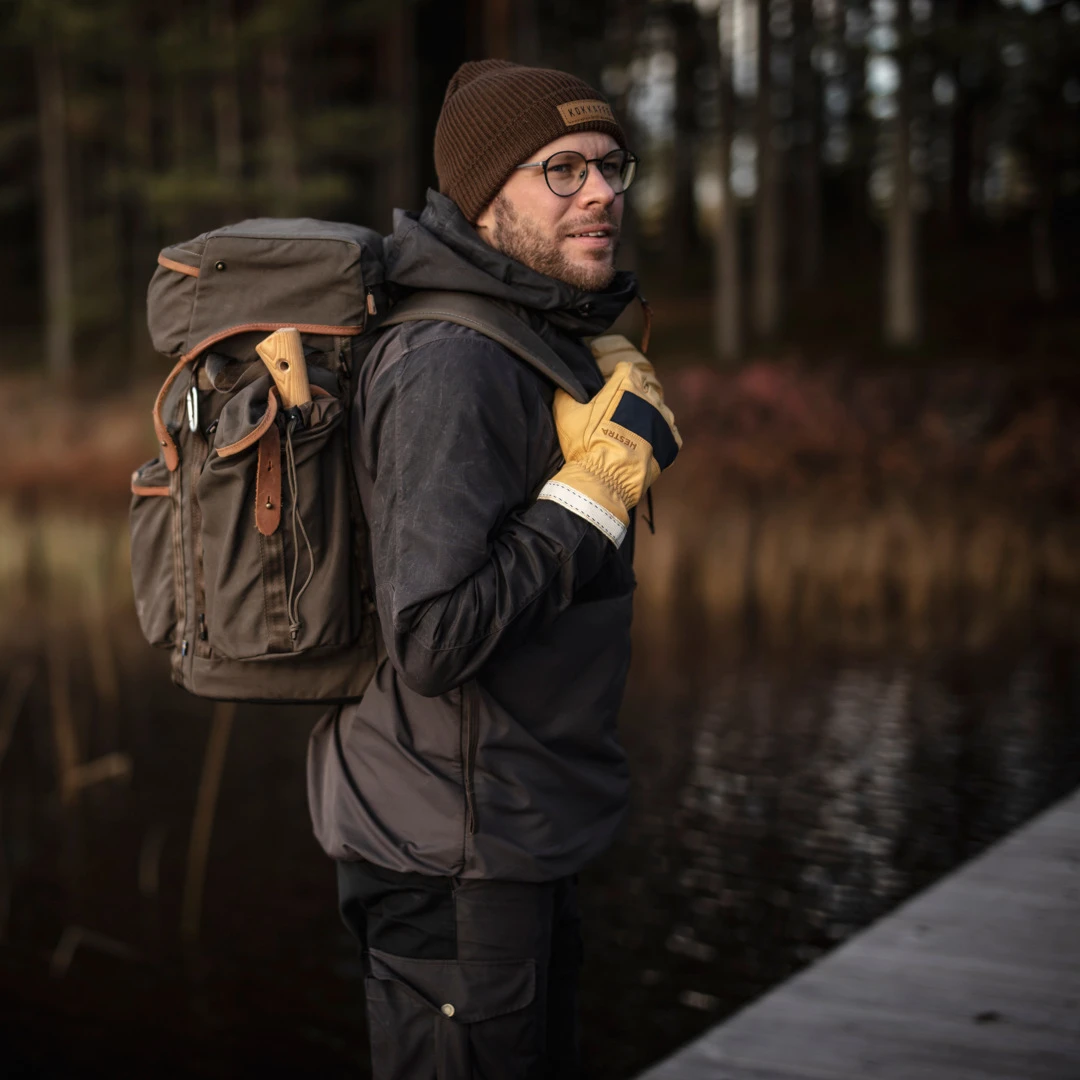 A sturdy, versatile leather glove for hiking, hunting, fishing and wilderness adventure. It has a removable knitted wool liner, easy to wash and dry if it gets wet or dirty. The outer glove in goatskin can also be worn on its own, as a tough work glove when chopping wood, setting up camp or handling game.